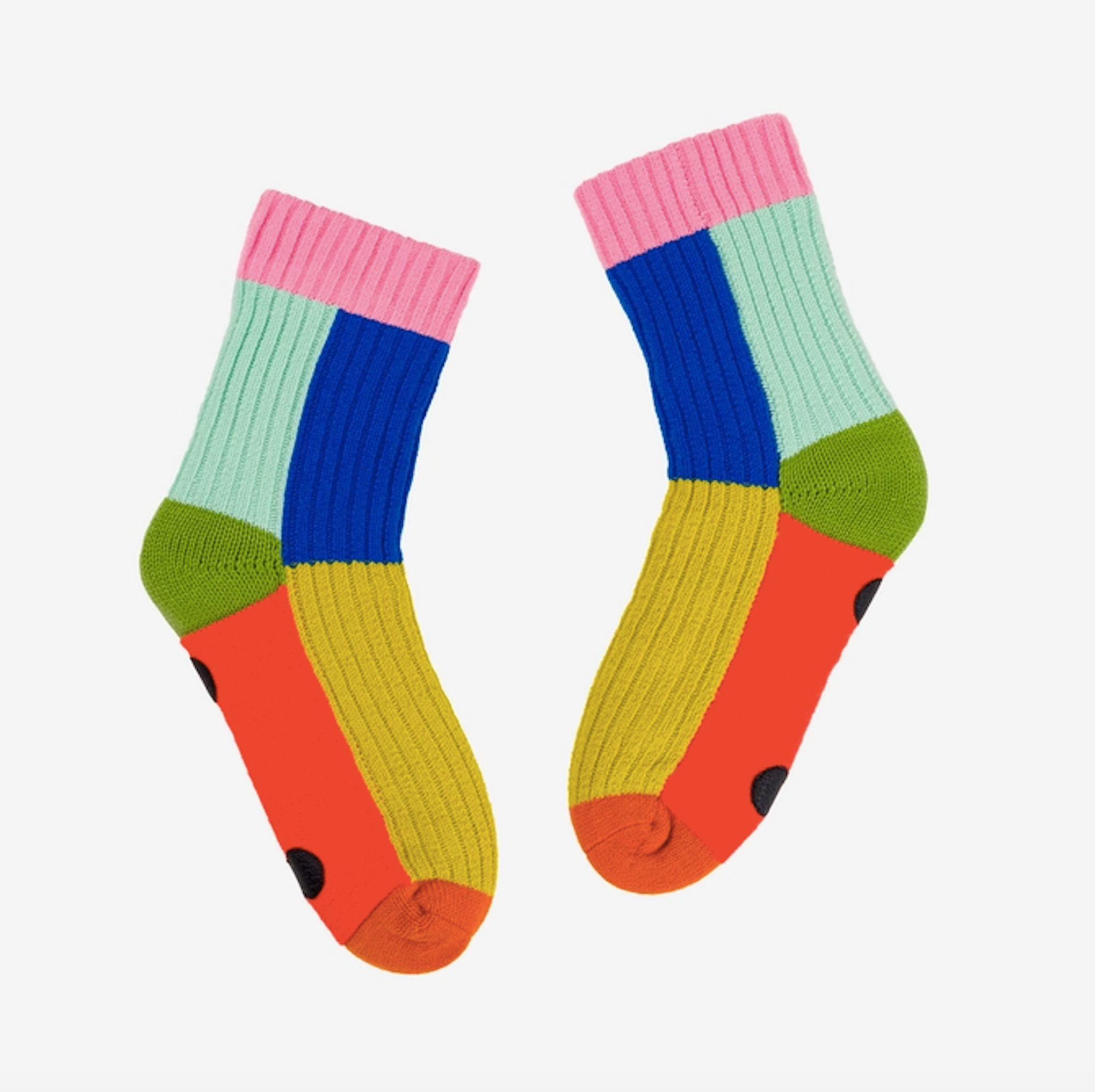 Unisex fleece-lined Knit House Slipper Socks keep feet cozy and warm with the easy fit of a sock and the plush comfort of slippers. Bright, bold color-blocked design and full faux-fleece lining. Non-slip soles provide a safe grip underfoot. Knit with soft acrylic repurposed deadstock yarn.