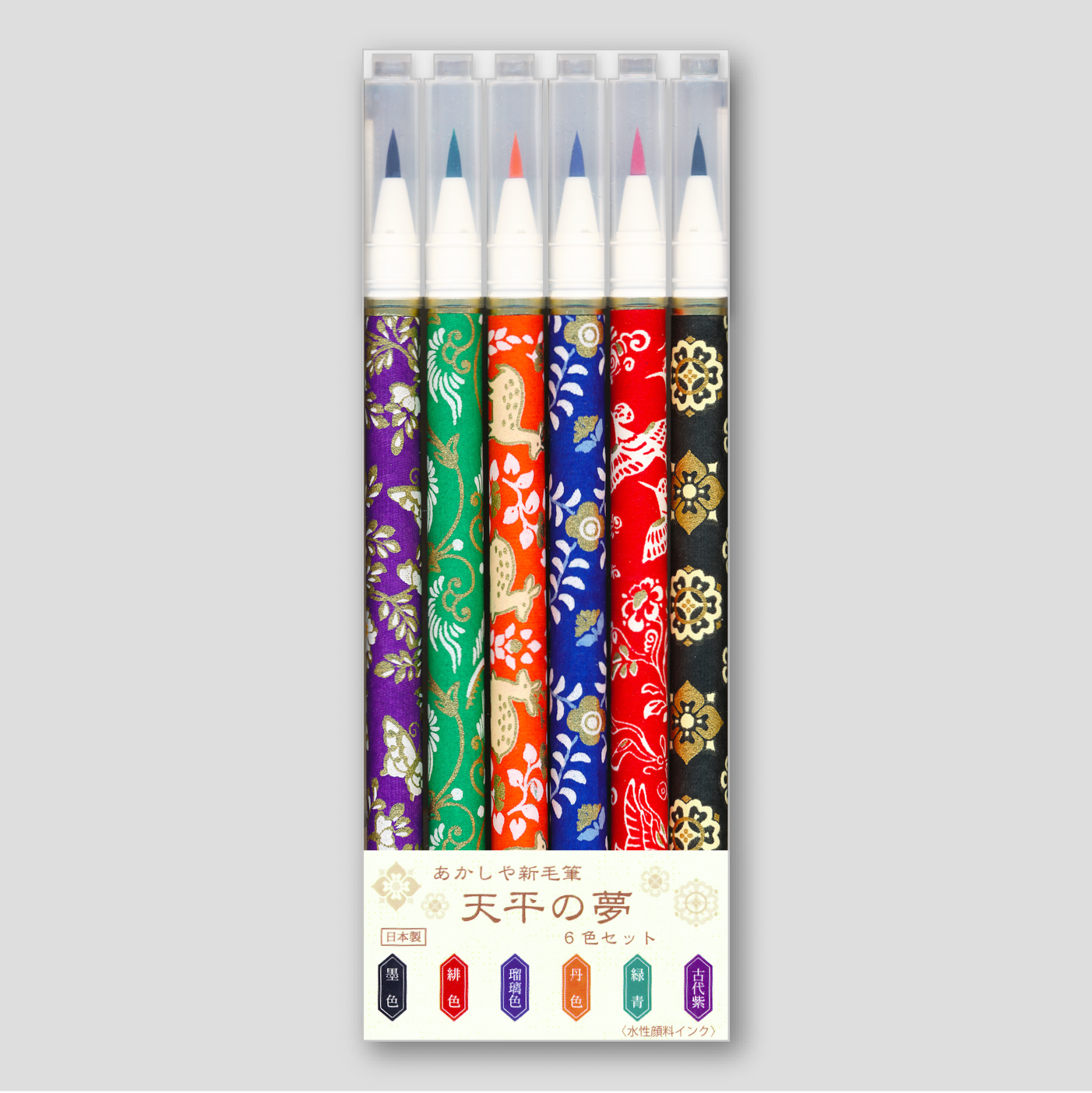 The Akashiya Brush Pen Set features six luminous colors. High-quality, water-based ink pigments flow through brush-style pens to create smooth, vibrant drawings and artwork. Each pen is wrapped in handcrafted washi paper, dyed and printed with elegant Tempyo-inspired patterns.