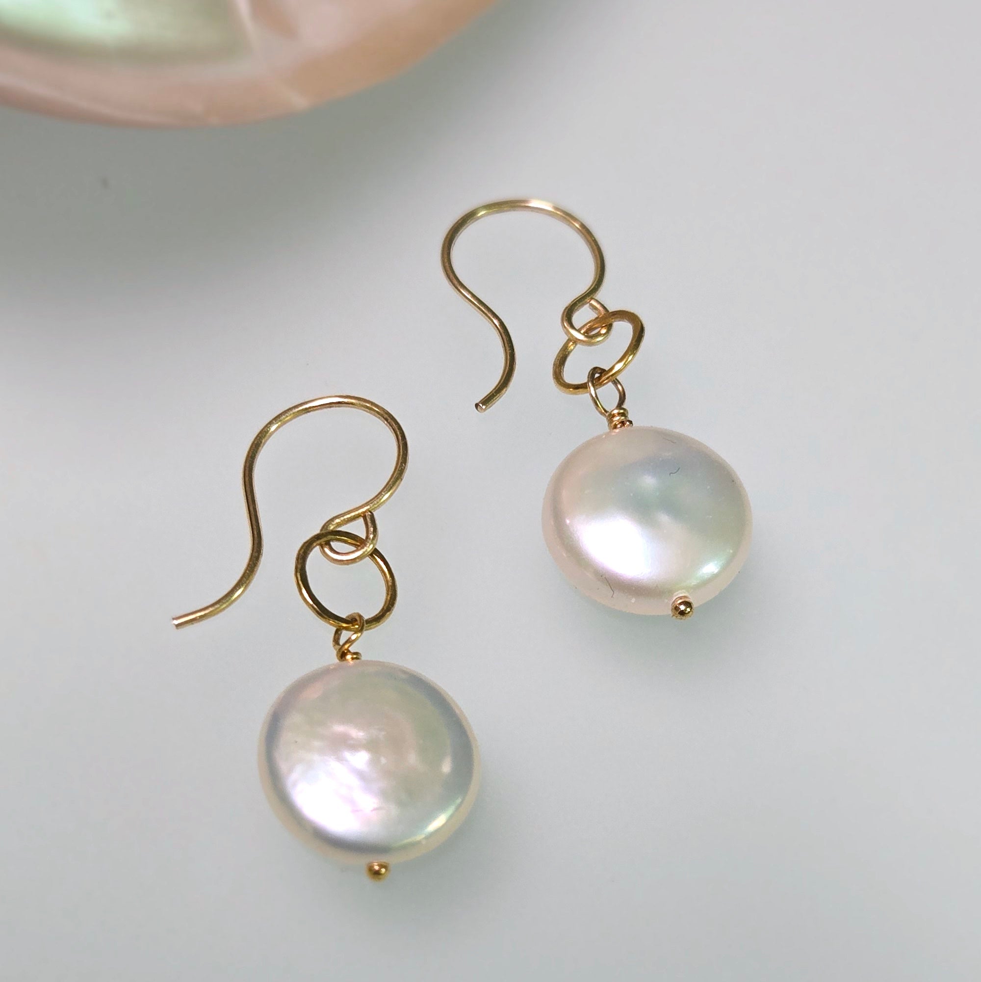 Coin Pearl Earrings showcase lustrous freshwater pearls suspended from handcrafted Shepard's Hook earwires. A fresh alternative to classic pearl studs, these drop earrings shimmer with a soft radiance. Dressed up or worn casual, they add an understated touch of natural elegance to any look.