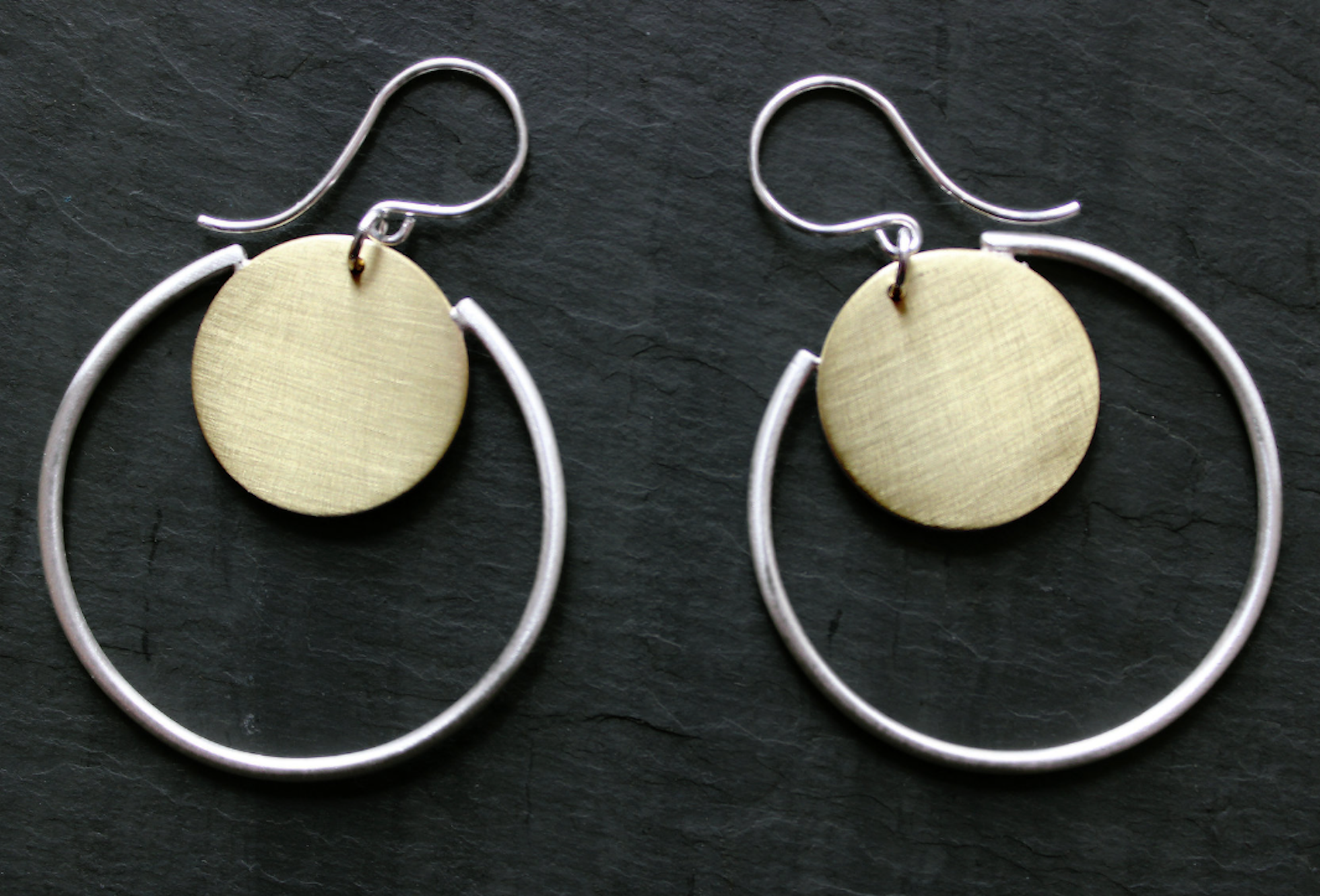 These striking statement earrings are formed and soldered with a sterling silver circular body and brass discs. They are designed to swing profile, as opposed to face on. Featuring sterling silver ear wires.