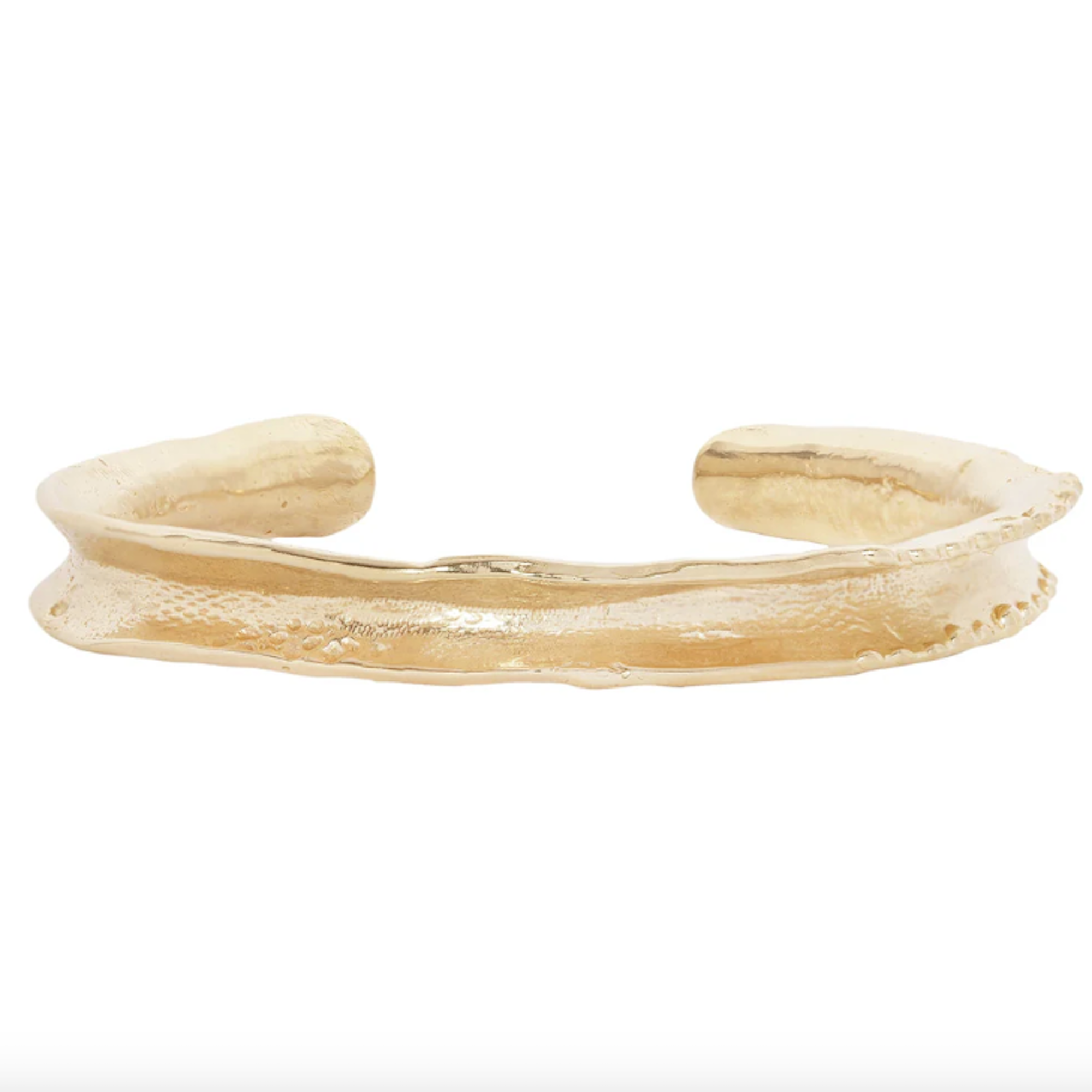 The Muhly Cuff Bracelet finds beauty in imperfection. Handcrafted in luminous yellow bronze, its organic silhouette mirrors the uneven shapes and textures found in nature. The slim profile and undulating edges create a soft yet edgy look. Wear as a bold solo statement or stack with more traditional pieces.