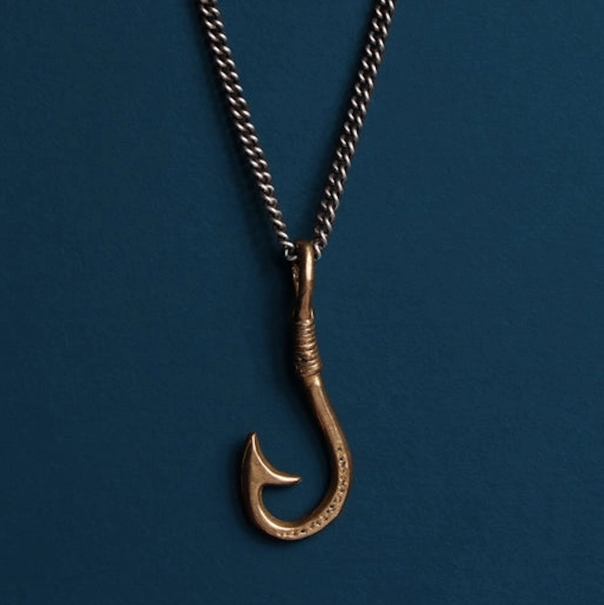 Throughout history, fishing hooks have been made from wood, bone, horn, shells, stone, iron, and bronze. This handsome fish hook pendant will capture dreams.