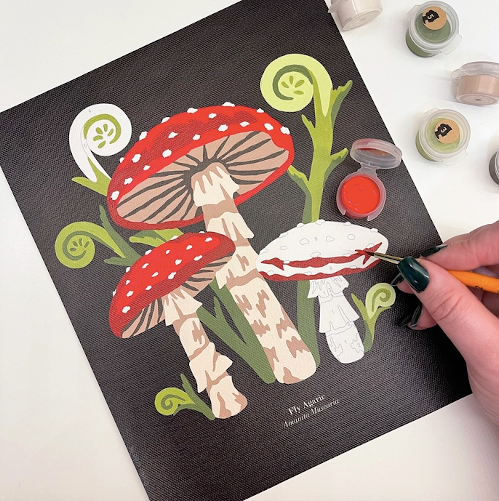 Fly Agaric Mushrooms features an encyclopedia plate showcasing red-dotted frilly Fly Agaric mushrooms. Pre-printed background features the name of the fungi on rich black. 3-5 hours to complete.