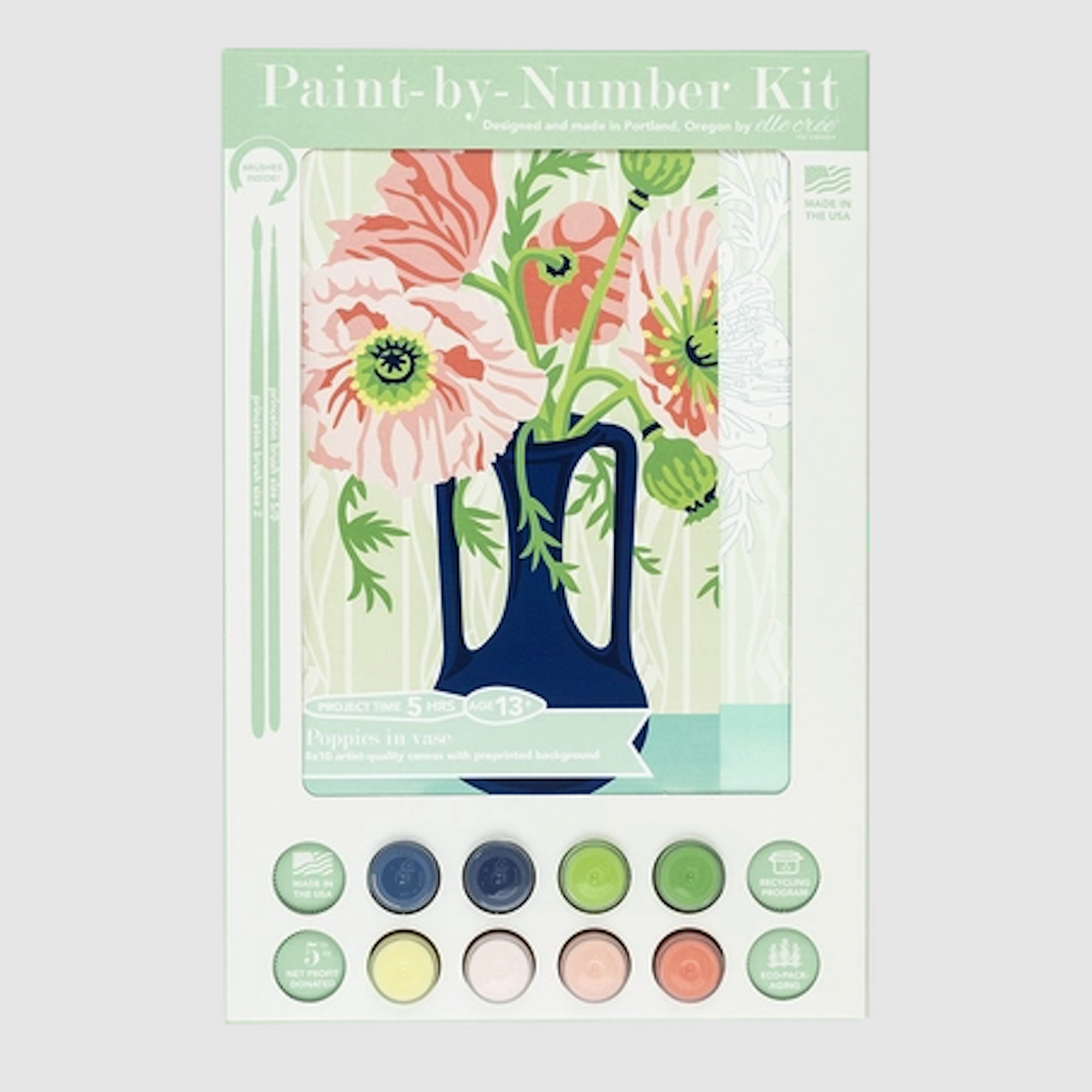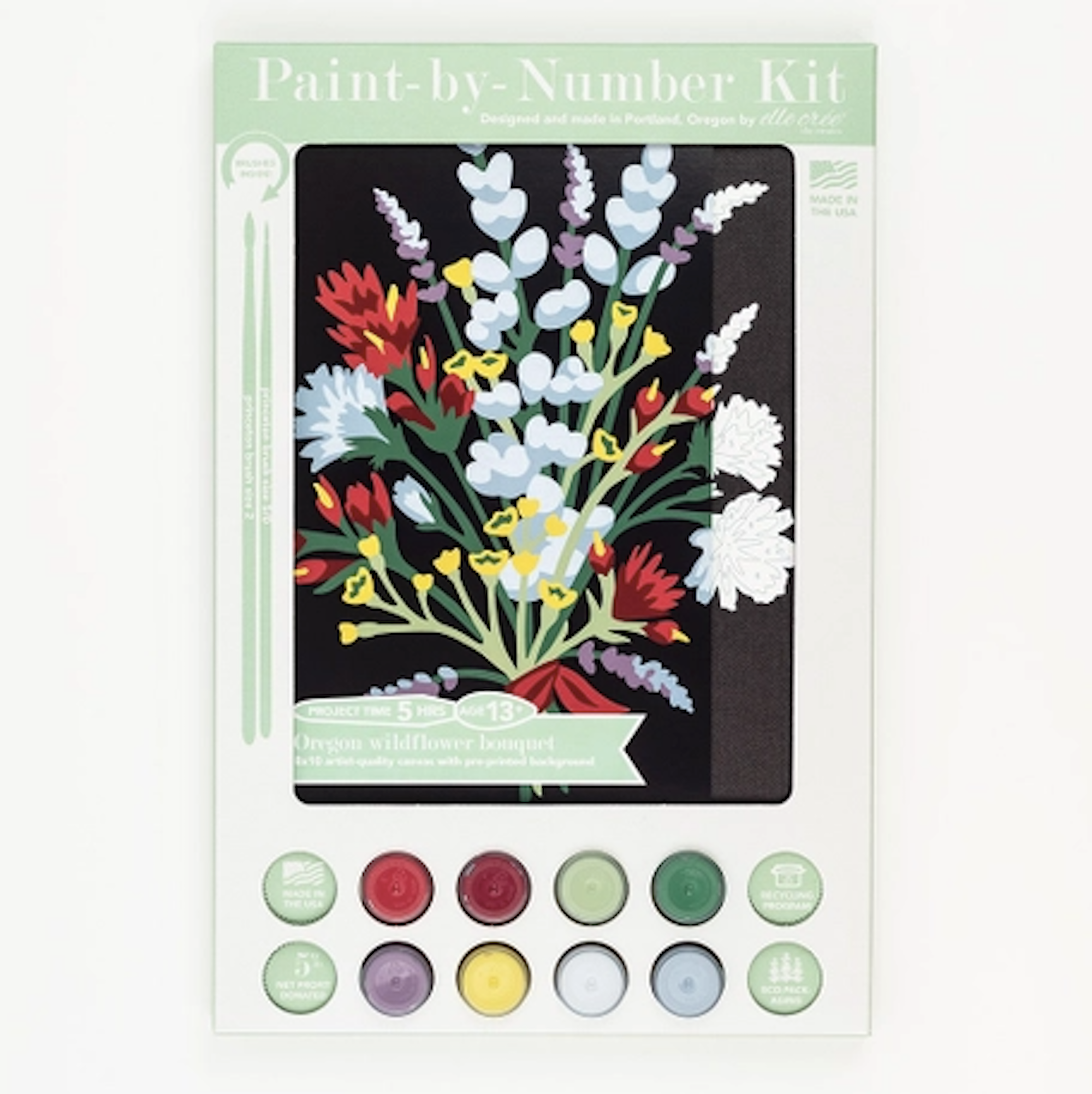 Eco-friendly Paint-By-Number Kit brings premium artist quality materials together in one thoughtful set. Responsibly and ethically sourced, each DIY paint kit is designed with sustainability in mind. Packaging is plastic-free and recyclable. Illustrated by Rachel Austen and assembled in Portland, Oregon.