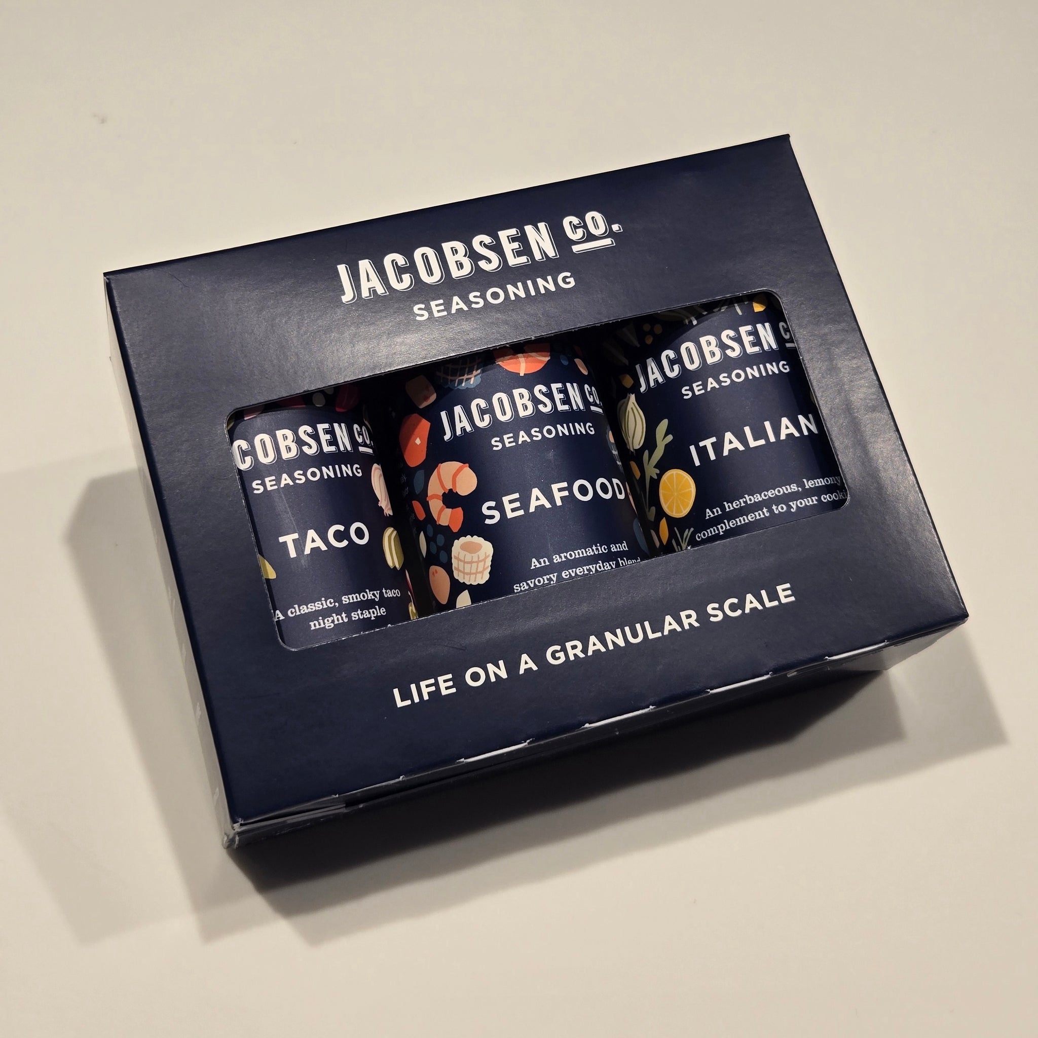 Taco Seasoning: A not-so-subtle mix of peppers, onion and cumin meets our pure fine sea salt, harvested from traditional salt ponds in Trapani, Italy, for a seasoning that brings a smoky kick to your favorite taco or quesadilla fillings. Want to mix it up? Use it in your next batch of sweet potato chili or cornbread stuffing. Net Wt. 2.3oz (65g)