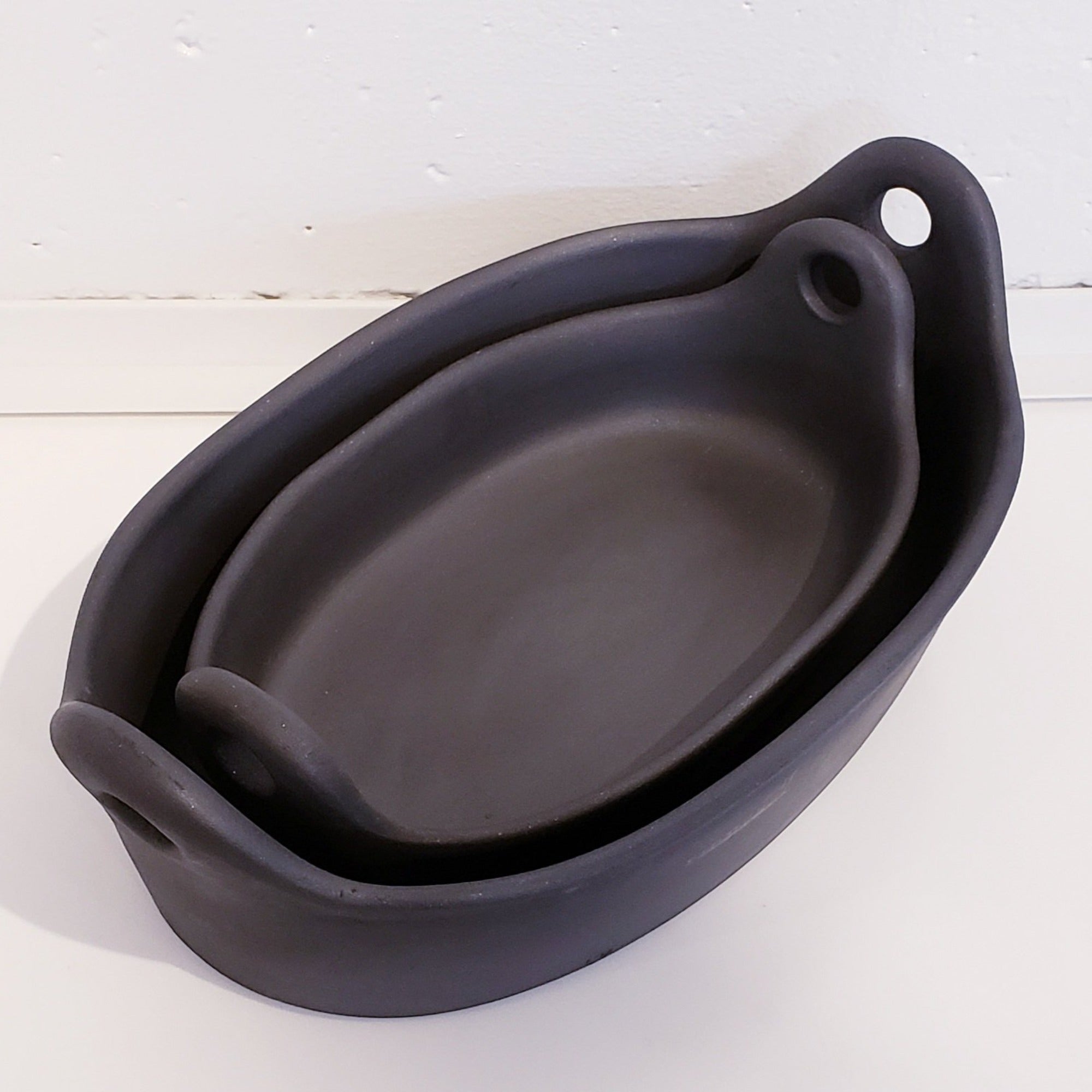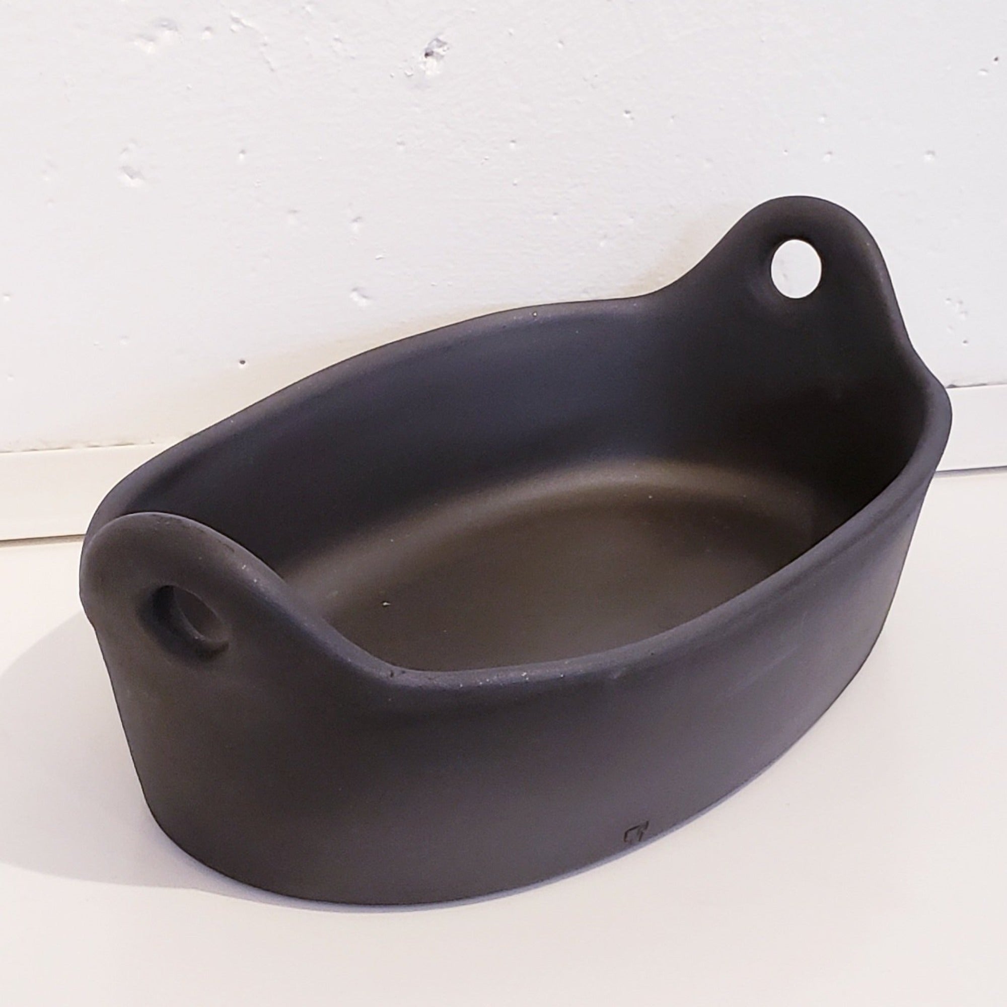 These wonderful hand shaped baking dishes made in Portugal of Barro Preto, black clay found in the northern region in Portugal, are perfect for serving directly from oven to table. The unglazed black matte finish adds a dramatic touch - and makes dishes more flavorful. Perfect for a chicken, roast, beans or a medley of vegetables. Enjoy the enhanced flavors this traditional unglazed black matte pot provides your dish.