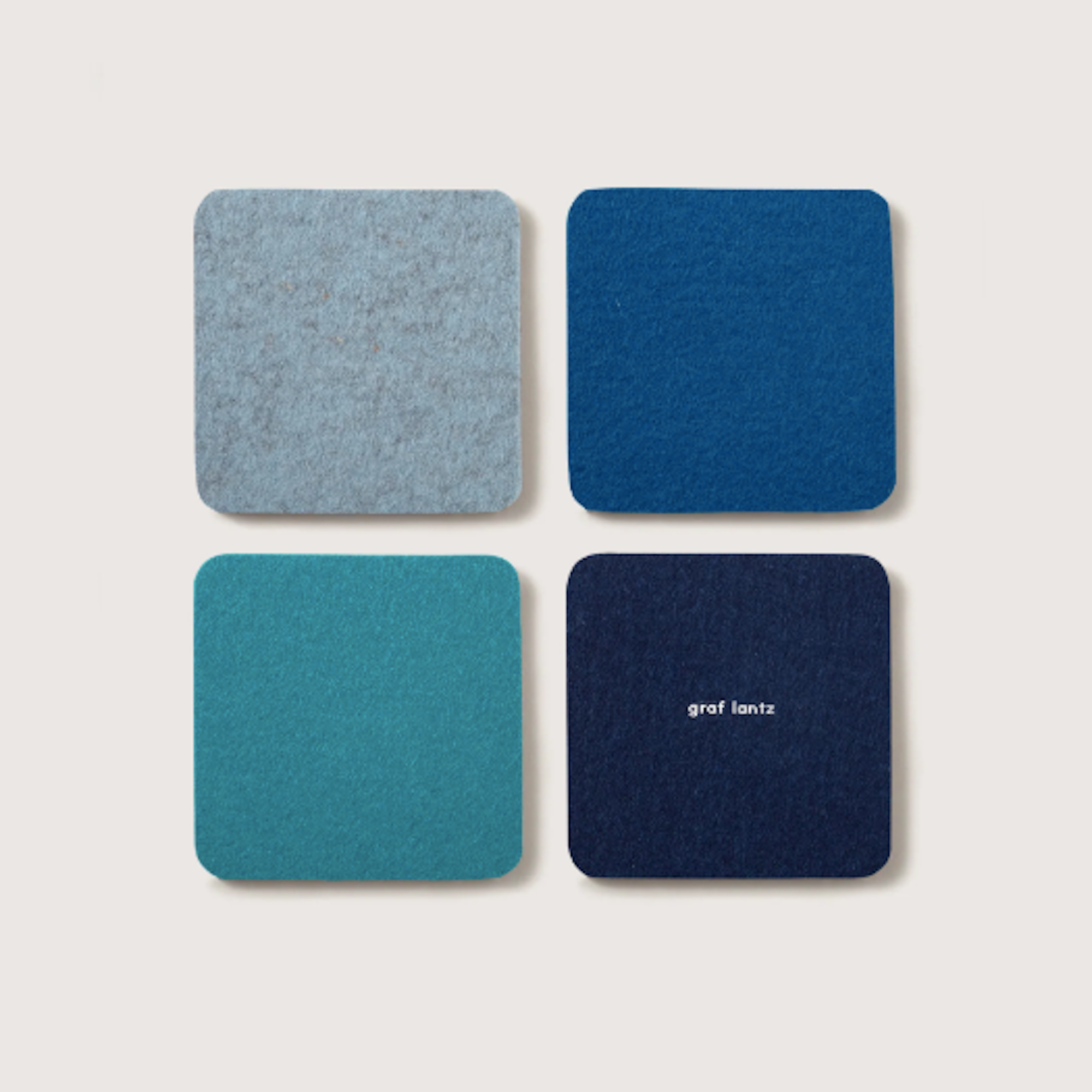 Colorful Felt Square Coaster - Multi 4 Pack Set is crafted from high quality 5mm Merino wool felt. Durable, sustainable, biodegradable, and renewable, Merino wool can absorb up to 30% of its weight without feeling damp. Coasters bear a discreet logo on the underside. Add a protective pop of color to any tabletop or surface.