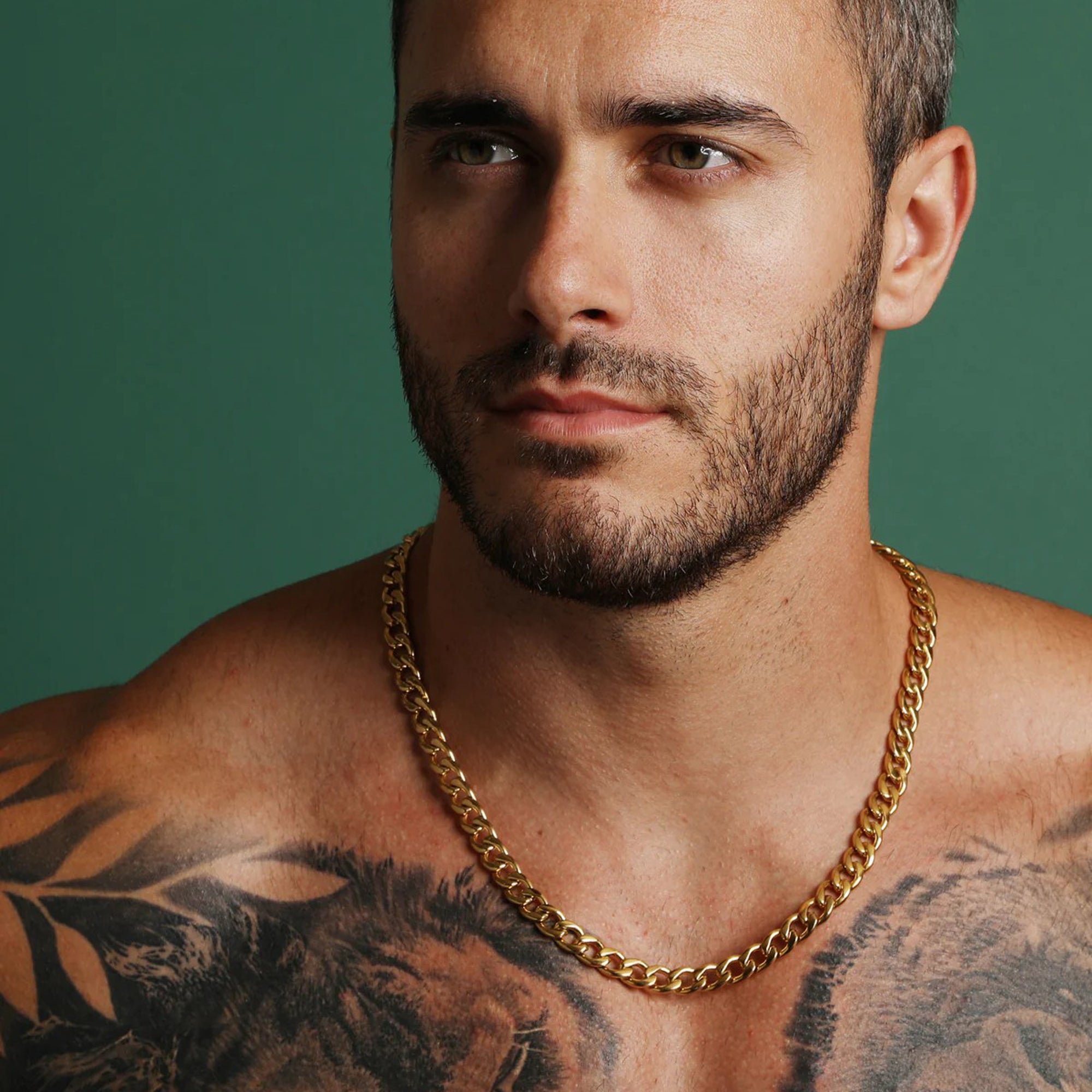 Sleek, modern Gold Curb Chain Necklace makes a bold, showcase statement. Large 9mm stainless steel cable chain is 10k gold plated. Wear the versatile 22" length solo or layered for casual or dress. Features a sturdy lobster claw clasp closure.