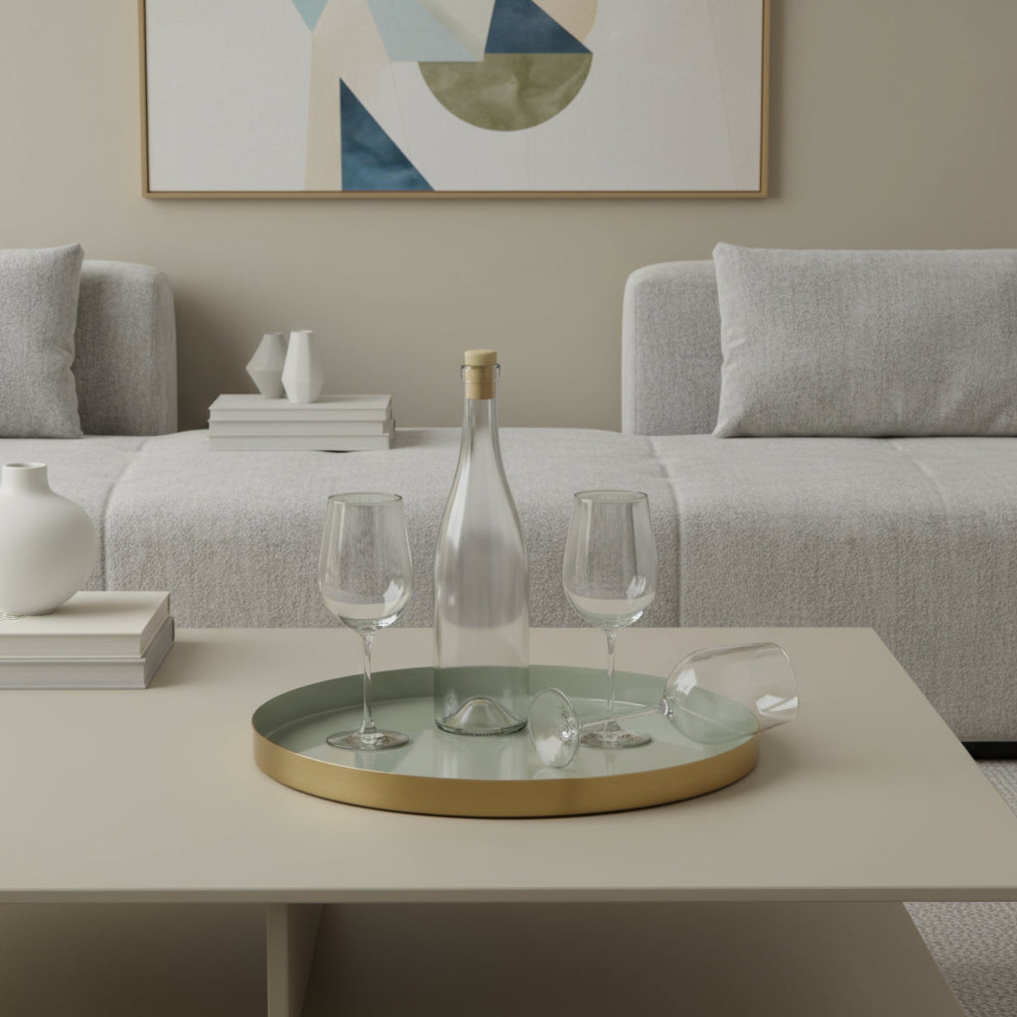 Illuminated by a golden halo, our vibrant Gold & Enamel Round Tray is handcrafted using sustainable materials. It's just the right size for beverage service or to display treasures on a tabletop.