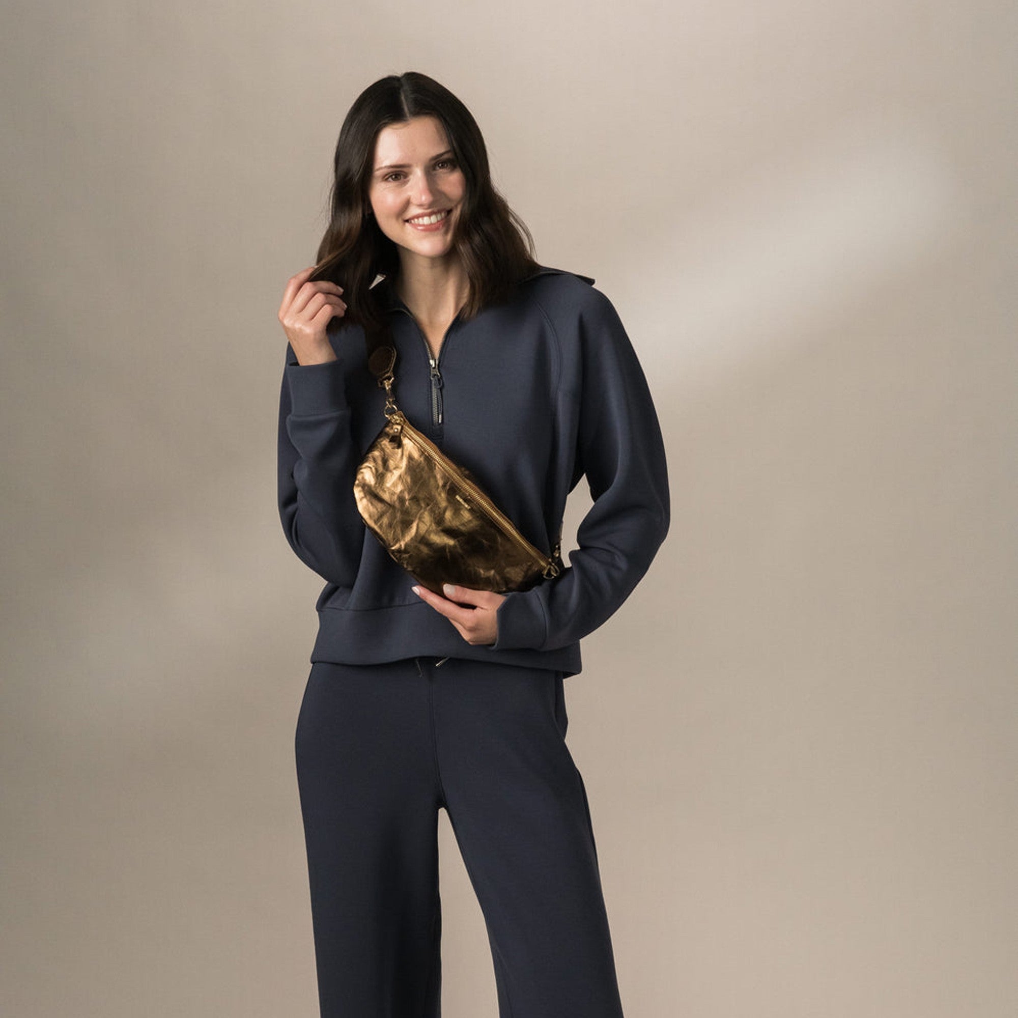 Sleek, sustainable Sling Crossbody Bag offers a stylish, compact space for phone, wallet, and essentials. Crafted from light, durable, eco-friendly washable paper. Designed to rest comfortably across the chest for hands-free movement. Removable, interchangeable crossbody strap allows for customized fit. An interior pocket keeps things organized, a sturdy zipper keeps things secure.